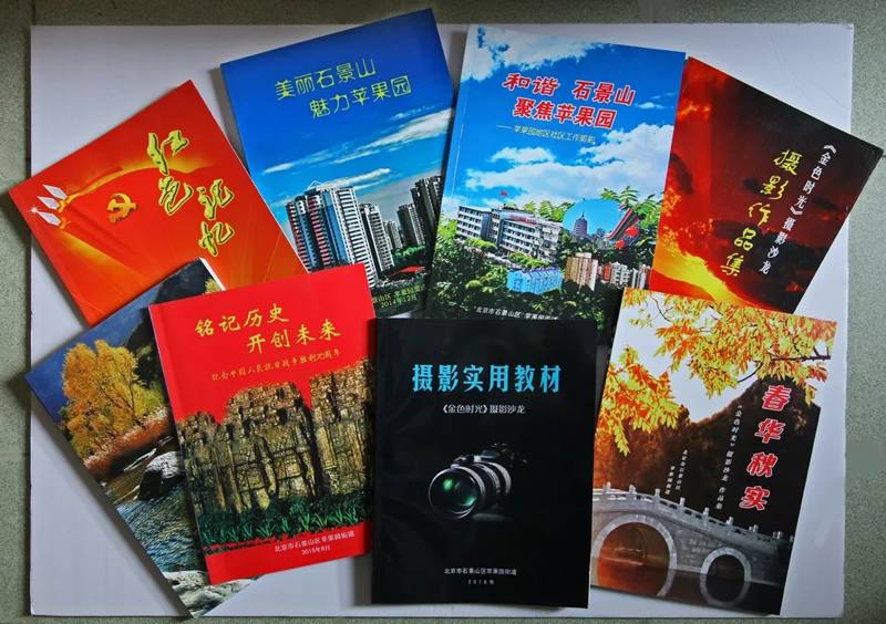 除此之外,还先后编辑出版了《美丽石景山 魅力苹果园》《摄影实用教材》和纪念抗日战争胜利七十周年的《铭记历史 开创未来》、庆祝建国七十周年的《我和我的祖国》,以及摄影作品精选集《春华秋实》等8本摄影画册。